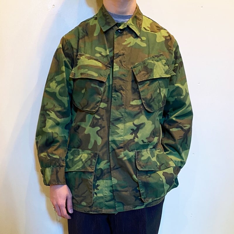 | 商品の特徴 | ジャングルファティーグ 3rdノンリップ ERDLリーフ カモLarge。ジャングルファティーグ 3rdノンリップ ERDLリーフ カモLarge。60's US.ARMY ERDL グリーンリーフカモ柄 ジャングルファティーグ。通常パターンより稀少?!【ERDLカモ】のファティーグジャケット。米軍 実物 ジャングルファティーグ- 素材: 100% コットン- サイズ: L - R 身幅63cw肩幅50cm袖丈62cm着丈80cm程- フロントに小穴等有り- ポケット: 2 Front Pocketsご覧いただきありがとうございます- 襟破れ、ポケット小穴リペア、小穴等有り-ご覧いただきありがとうございます | ||