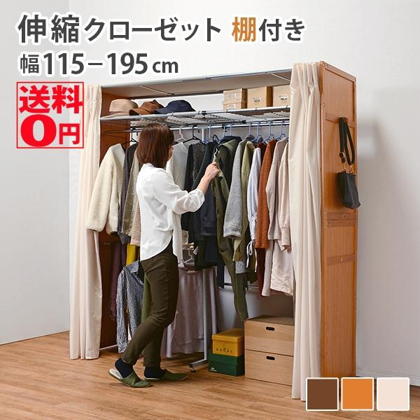 - 洋服タンス・押入れ収納 > ハンガーラック・ポールハンガー > 【新品】☆組立式 伸縮クローゼット ハンガー付きOK☆ (美品アウトレット) HAGiHARA(萩原) 天板 カーテン付き 伸縮 木製 クローゼット ハンガー
