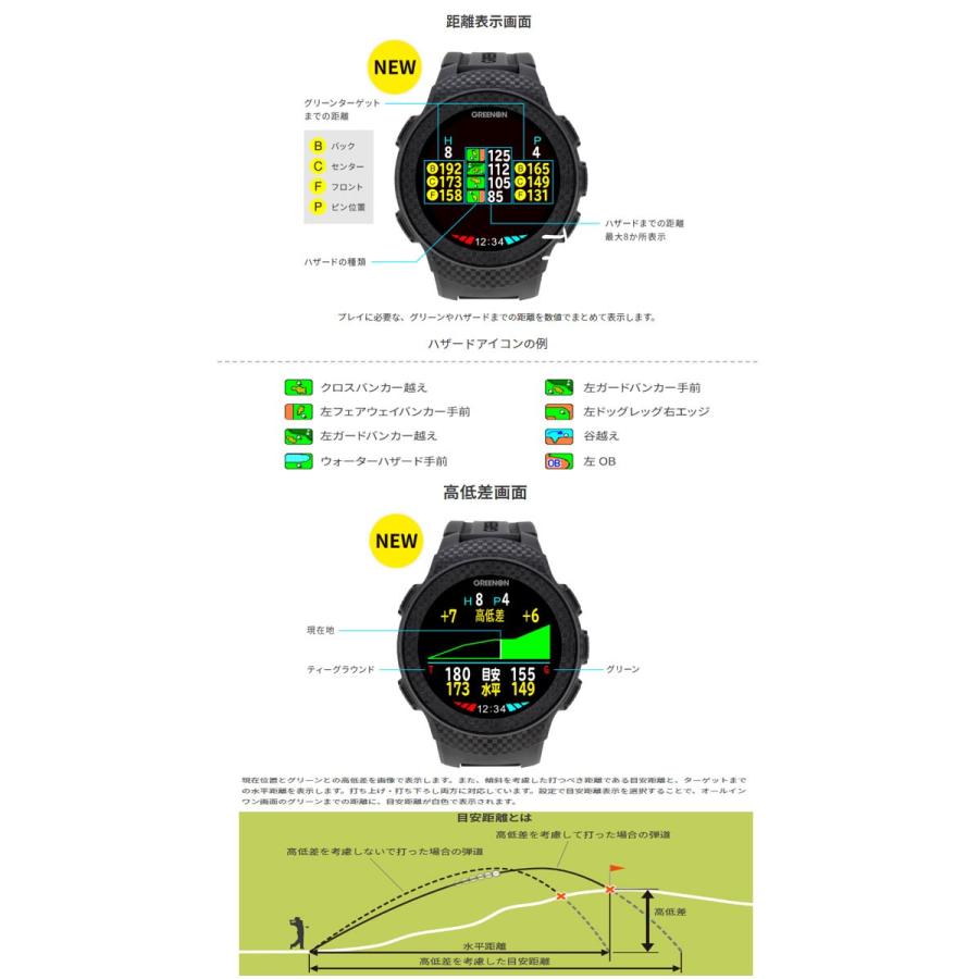| 商品の特徴 | 24時間限定値下げ中】GPSゴルフウォッチ A1 24時間限定値下げ中】GPSゴルフ。楽天市場】【大感謝祭限定!10%OFFクーポン対象】【公式】 ゴルフ。GREENON(グリーンオン) GPS距離計 THE GOLF WATCH A1-III(ザ。GPSとBluetooth機能を搭載したゴルフ用スマートウォッチ。- モデル名: A1- Bluetooth機能: あり- GPS機能: あり- バンドサイズ: 160-220mm- 本体サイズ: 48.6×48.6×12mm- 重量: 160g画像の内容が全てです。。THE GOLF WATCH A1-II | GREENON。Bushnell PRO XE ゴルフ用距離計 おまけ付き | ||